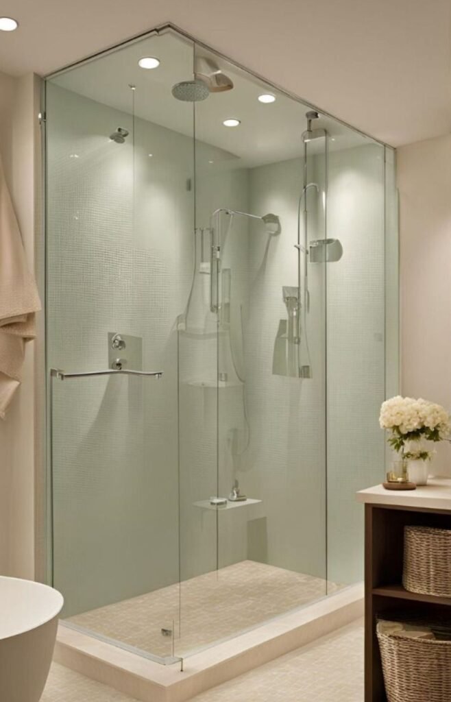 Premium shower glass enclosures for bathrooms using toughened safety glass. Available in sliding, hinged, and frameless designs with high-quality fittings to prevent water leakage and ensure long-lasting performance.